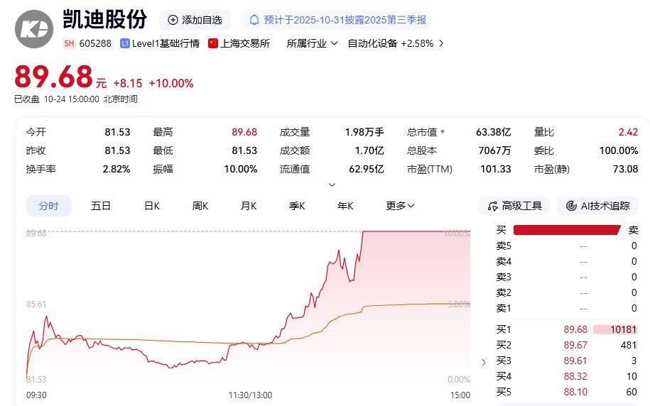 24日,电气部件与设备板块走强通盈证券,凯迪股份午后拉升涨停通盈证券,报89.68元/股。截至收盘,换手率2.82%通盈证券,成交额1.7亿元。